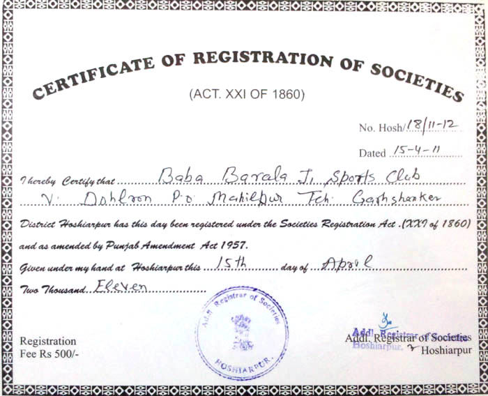 “Baba Barala Ji Sports Club” was registered in 2011 under the Indian Societies Registration Act (XXI of 1860) with the combined efforts of all the youths from the Village. The objectives and vision of the Sports club are as follows:-